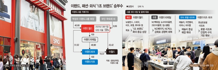 이랜드그룹이 패션과 외식 부문을 필두로 공격적인 외형 성장에 박차를 가하고 있다. 유통·패션 업계 전반이 소비 위축과 고환율 등으로 '긴축 모드'에 돌입한 것과는 대조적이다. 특히 스파오와 애슐리 등 간판 브랜드를 '메가 브랜드(1조 클럽)'로 육성해 시장 지배력을 공고히 하겠다는 전략이다. 단기 차입금 증가와 유동성 저하라는 재무 부담에도 불구하고 정면 돌파를 택한 이랜드의 공세적 확장 전략에 업계의 관심이 쏠린다.9일 금융감독원 전자공시시스템에 따르면 이랜드그룹은 박성수 회장이 최대주주인 이랜드월드를 정점으로 패션·유통·외식 사업이 유기적으로 연결된 지배구조를 형성하고 있다. 박 회장은 이랜드월드 지분 40.68%를 보유하고 있으며, 배우자 곽숙재 씨(8.06%) 등 특수관계인 지분을 통해 오너 중심의 구조를 유지하고 있다. 이랜드월드는 그룹의 모태인 패션 사업을 직접 운영하는 동시에 이랜드리테일(유통)과 이랜드파크(외식·호텔) 등을 자회사로 거느리고 있다.